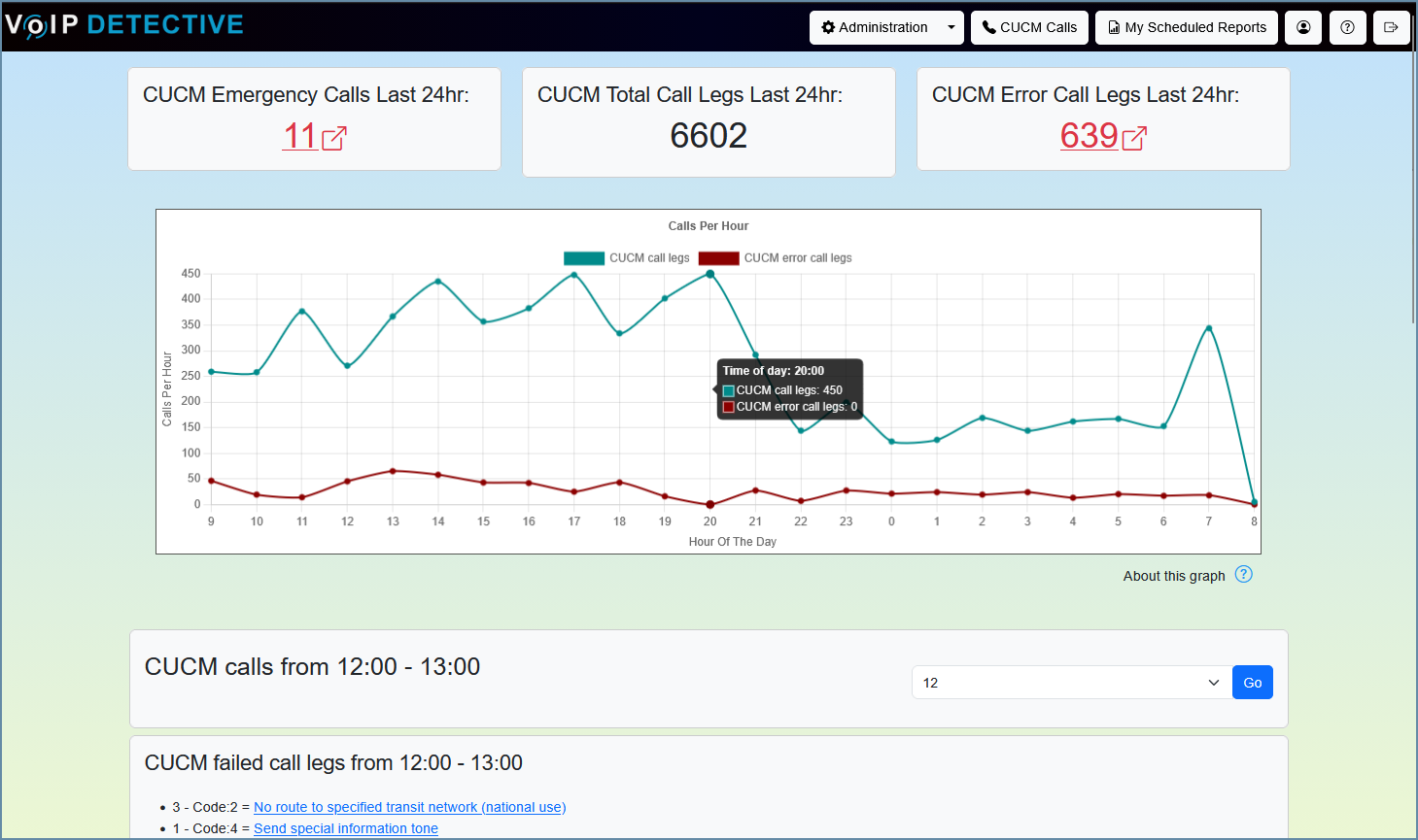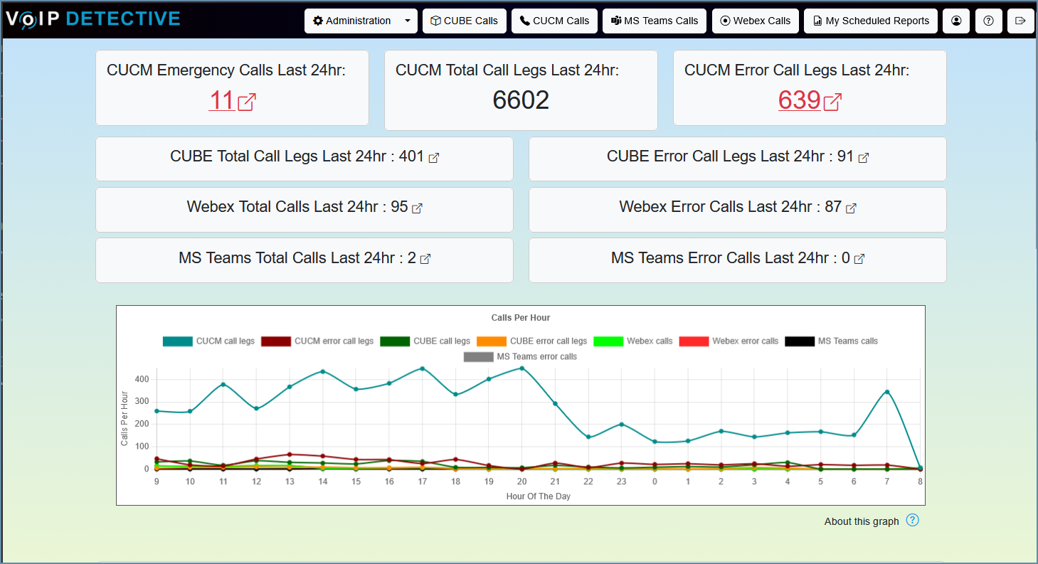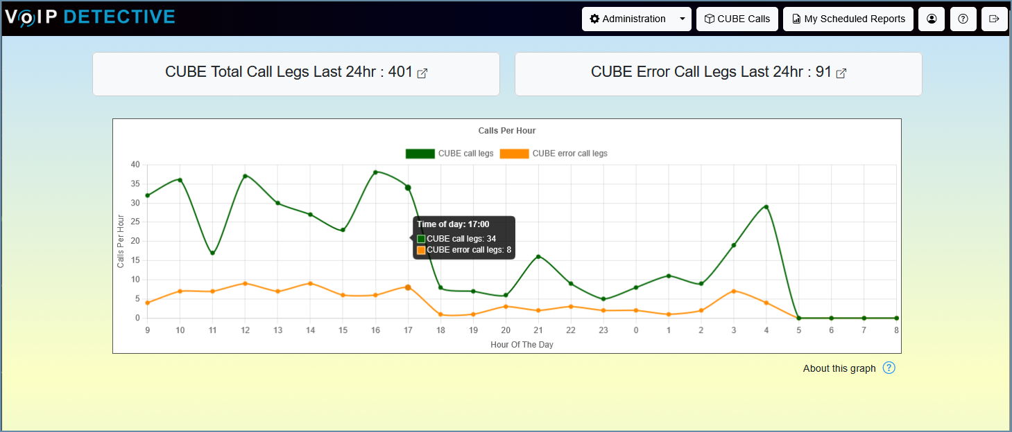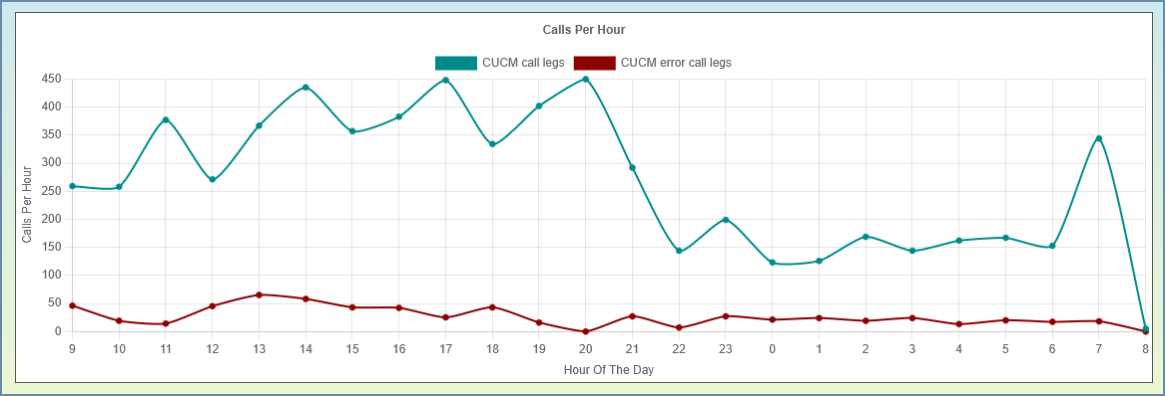 The CUBE Dashboard will provide information about total call legs, as well as hour by hour breakdown.