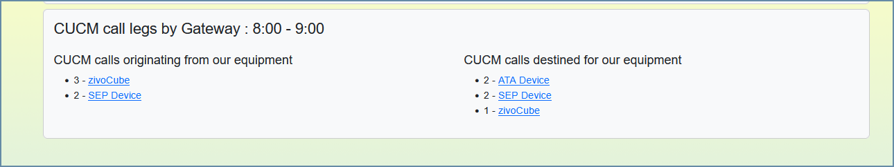 - Call legs by Gateway - call legs that have traversed each gateway during that time period. Gateways with 0 calls will not be listed.