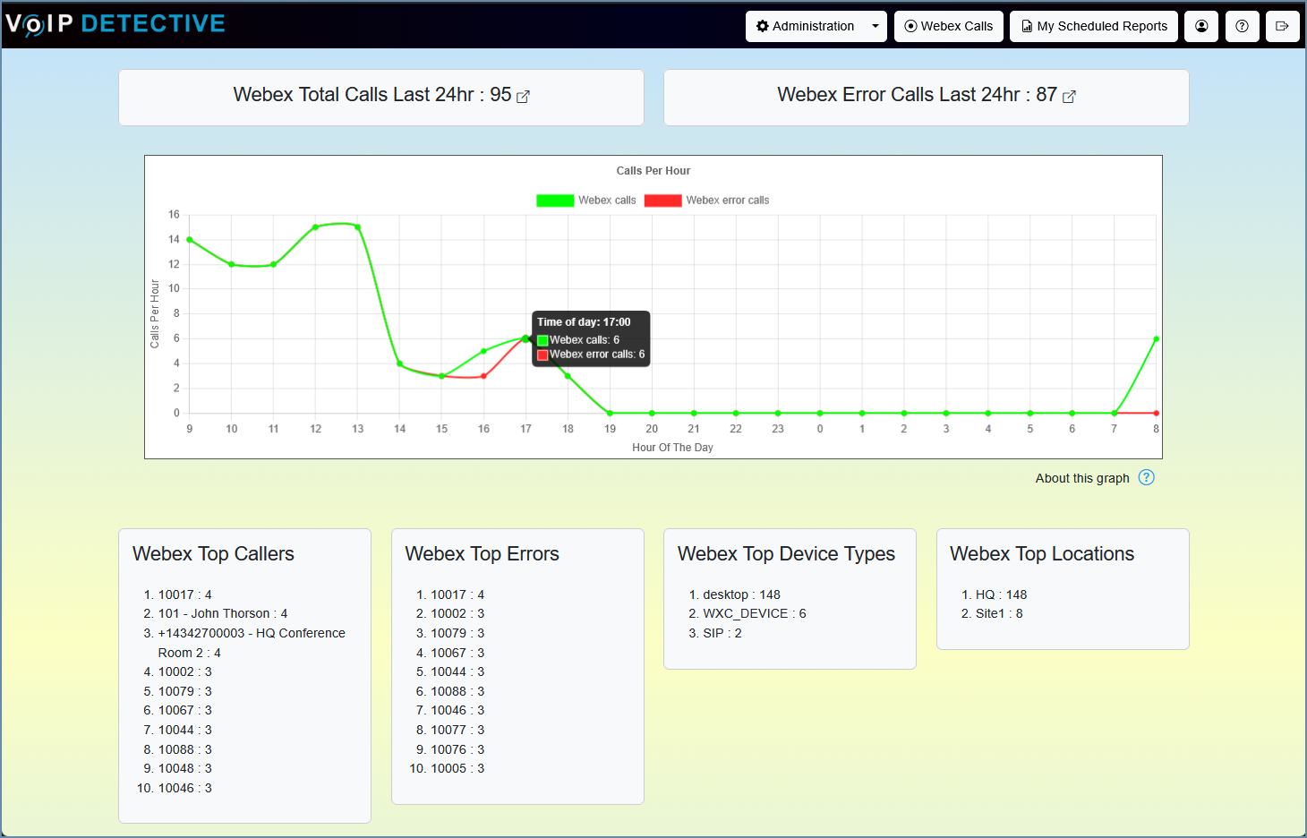 The Webex Calling Dashboard will provide total calls over the last 24 hours, as well as the number of Error Calls.