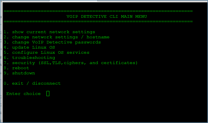 - Log into the VoIP Detective CLI (command line interface). This can be done by using an SSH client (such as putty), or by using the VMware or Hyper-V console. You should use the username cliadmin (password can be found here).