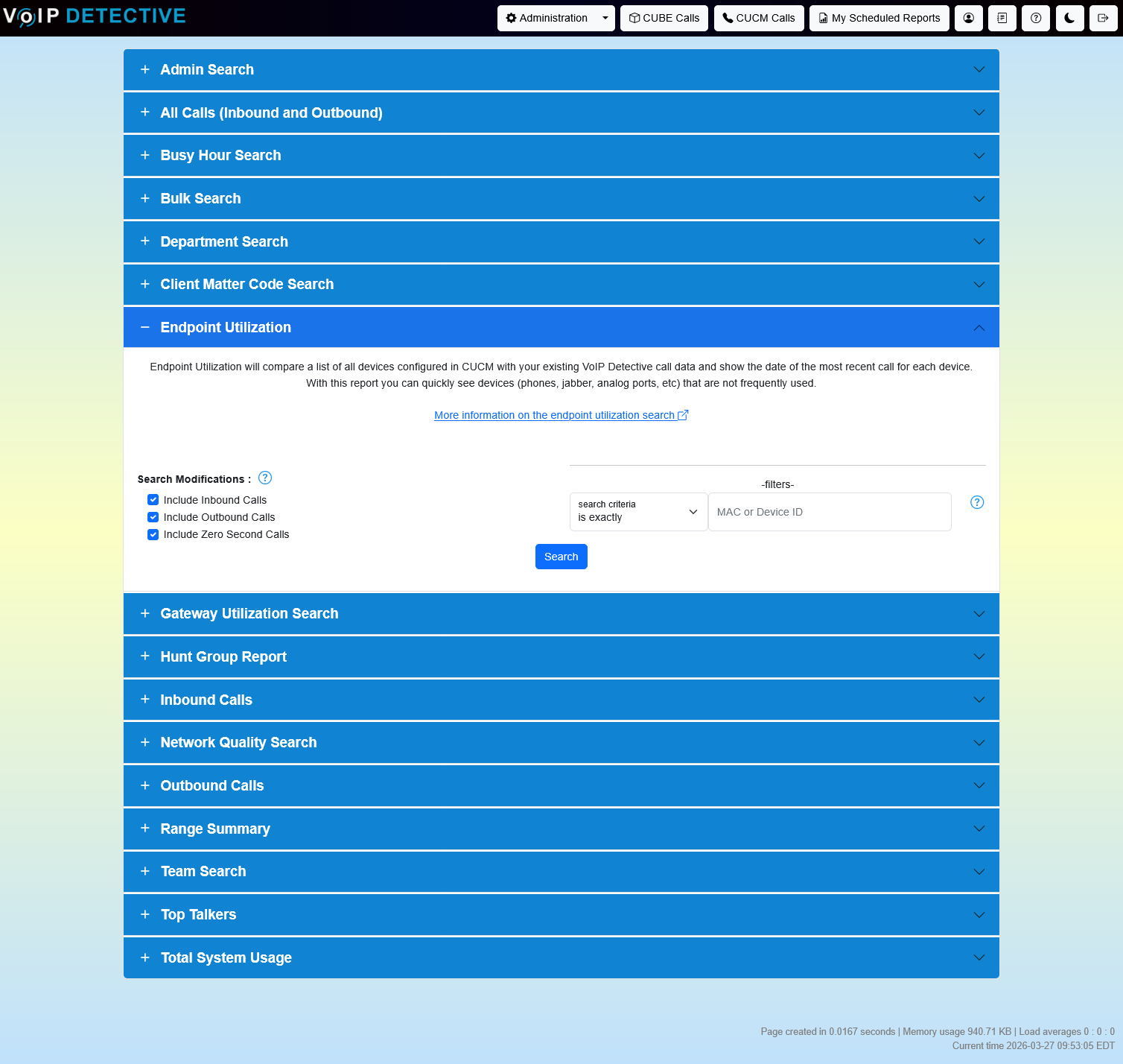 Navigate to the CUCM Calls search page and expand the “Endpoint Utilization” accordion section.