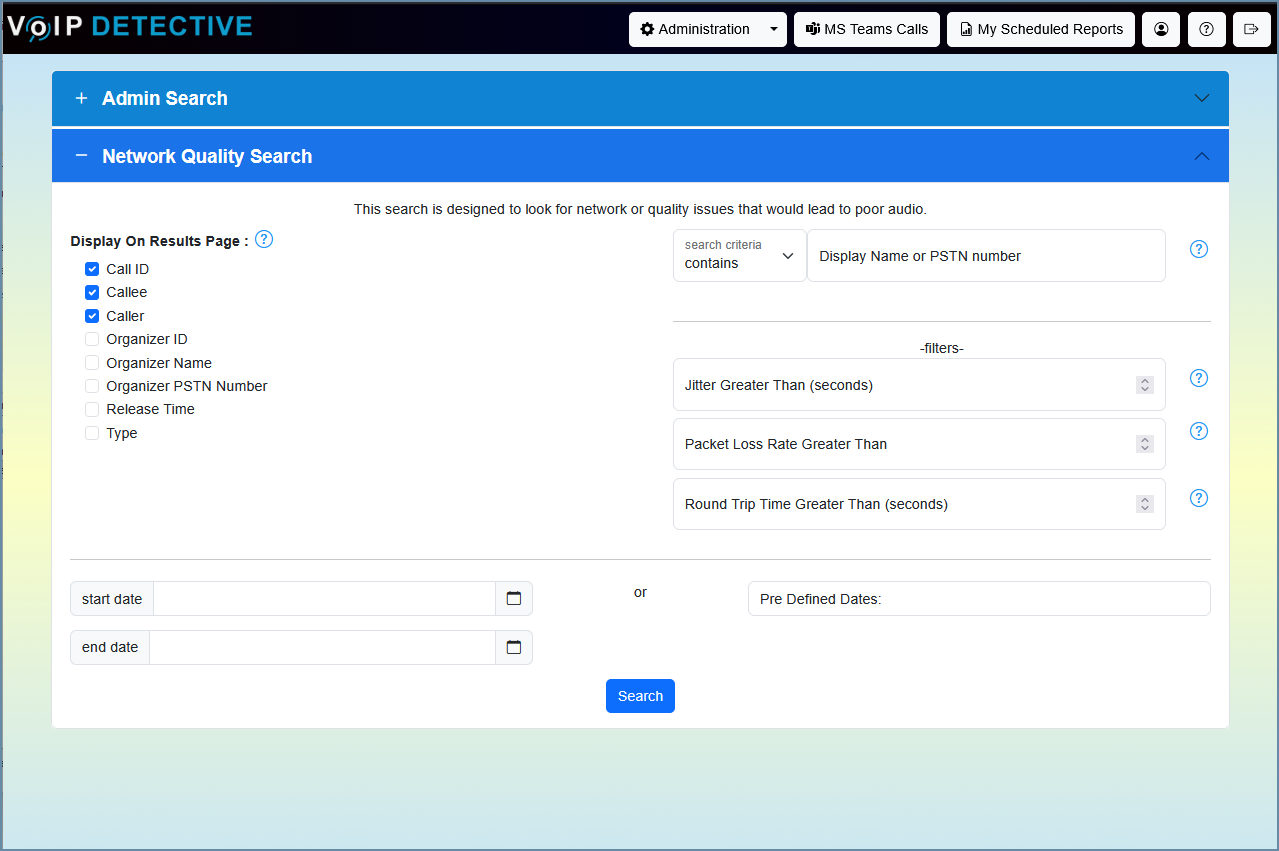 The network quality search is a component of VoIP Detective that helps identify calls across your organization that meet certain call quality standards that you set. The goal is to allow an administration to quickly identify MS Teams calls that resulted in a poor experience due to Jitter, Packet Loss, and Routed Trip Time (latency).