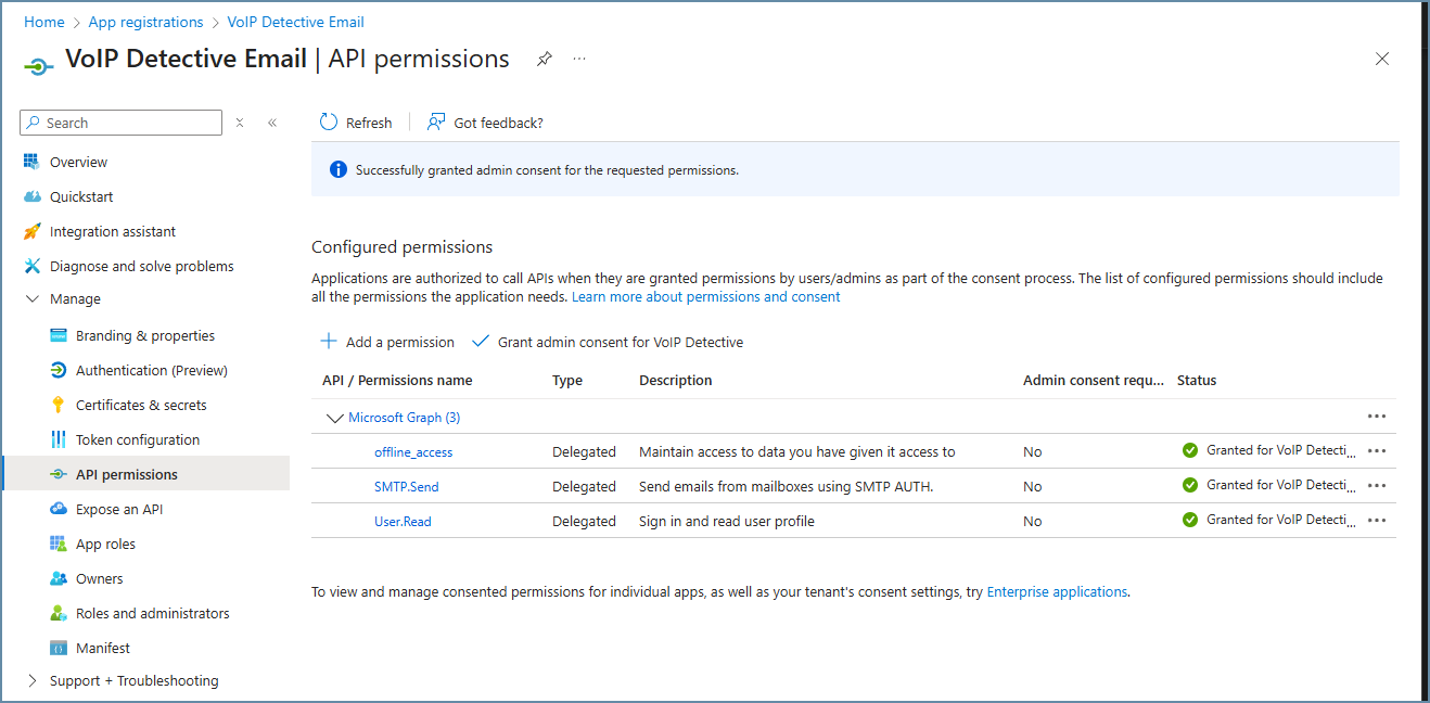 - Verify the SMTP.Send permission is added and admin consent is granted